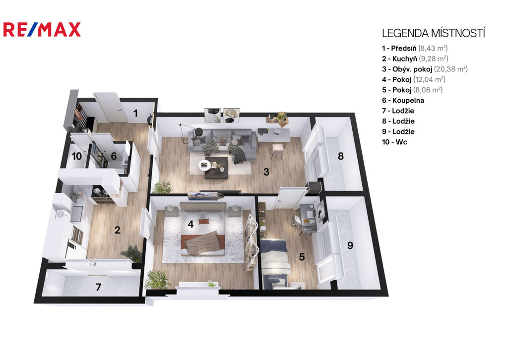 Dvě ze tří lodžií jsou zasklené (u kuchyně termoizolační dvojsklo) a poskytují místo k posezení, sušení prádla a pěstování květin a bylinek. Byt je v osobním vlastnictví a nachází se v původním, ale udržovaném stavu, což novým majitelů umožní vytvořit interiér podle vlastních představ.