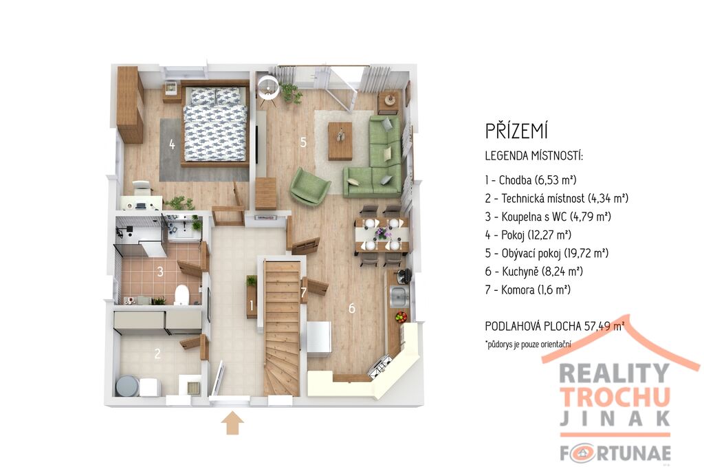 1.NP - Obývací pokoj, kuchyň, ložnice, chodba, technická místnost, koupelna (sprchový kout) s WC, komora.