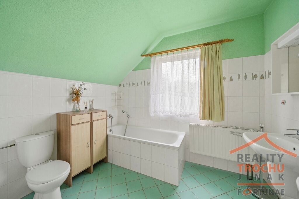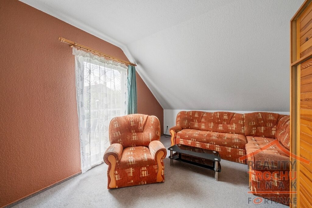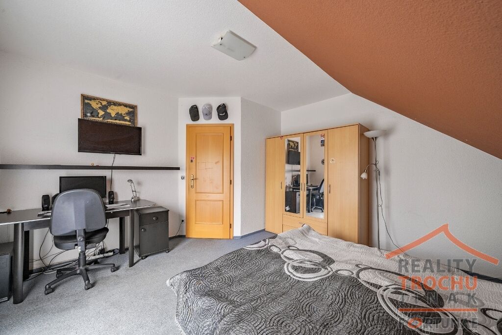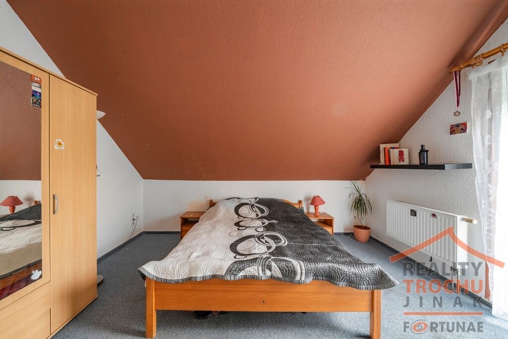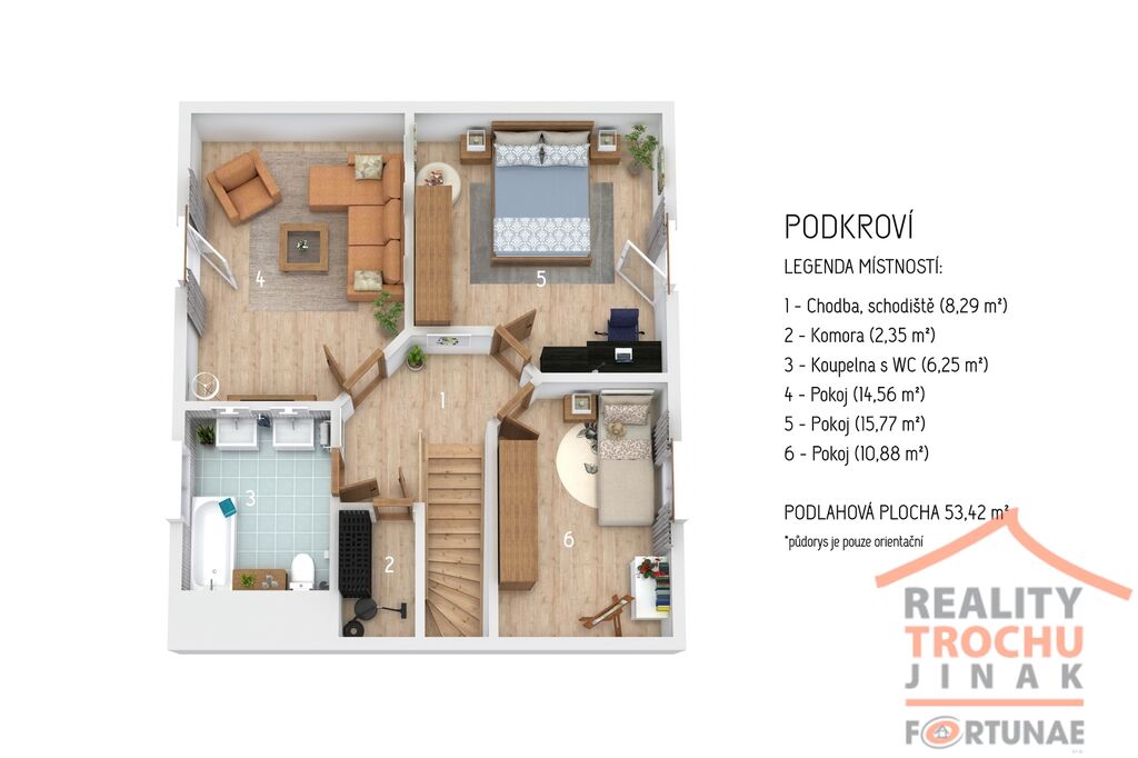 Podkroví - 3x ložnice, koupelna (vana) s WC, chodba, schodiště, komora