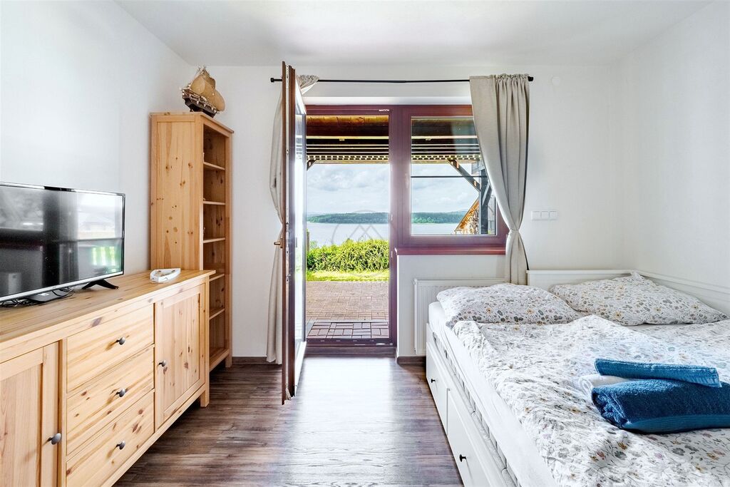 Jednotka o podlahové ploše 32m2 je promyšleně navržena a disponuje zádveřím s úložným prostorem, koupelnou s WC, dále obývacím pokojem s kuchyňským koutem a vstupem na luxusní terasu (15,6m2) s dechberoucím výhledem na širokou hladinu Lipna a západ slunce.