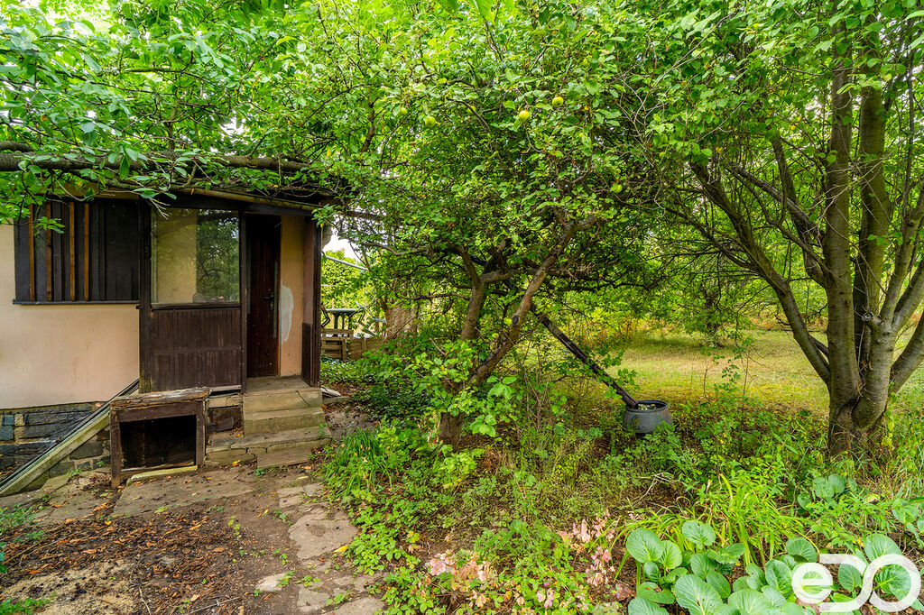 Rovinatý pozemek o rozloze 308 m² (včetně zastavěné plochy chaty) se vzrostlou zelení a příjemnou, svěží atmosférou.