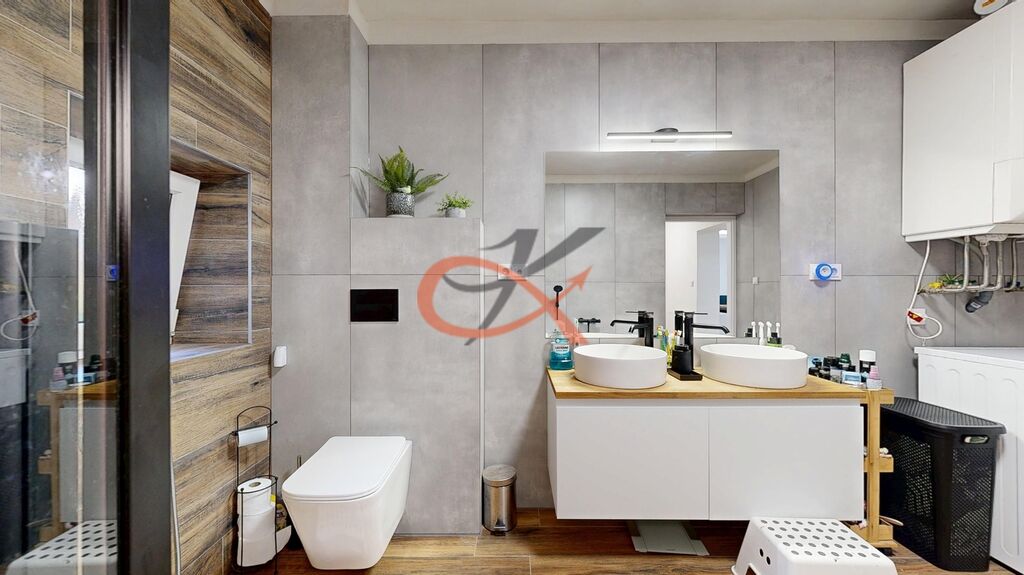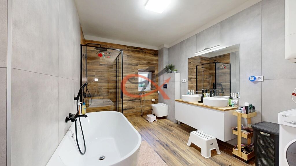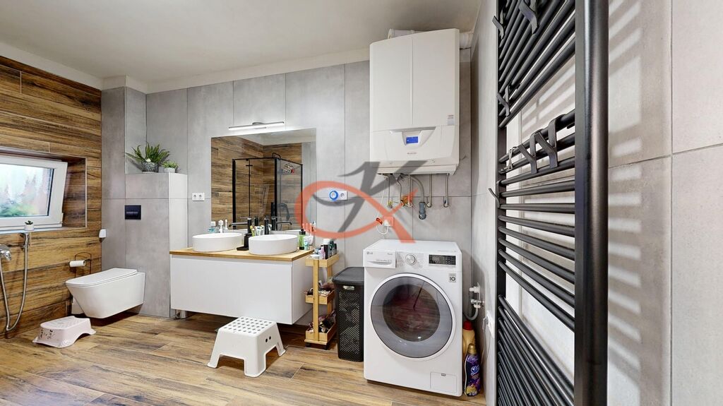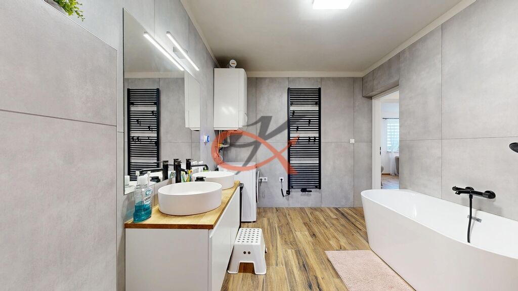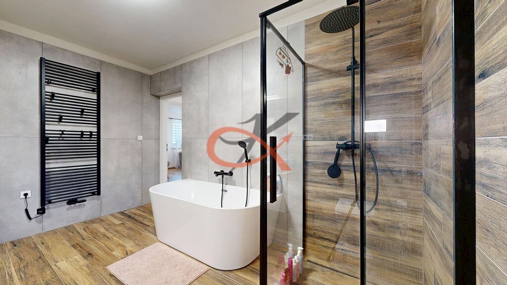 V přízemí se nachází stylová koupelna s vanou i sprchovým koutem, a samostatné WC. Nové interiérové dveře, obložky a vhodně zvolené LED svítidla přidávají interiéru na moderním vzhledu.