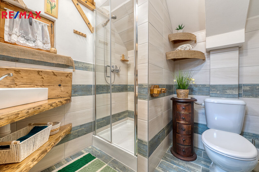 Druhý vchod vede do chodby, z níž je přístup do koupelny, kuchyně, sklepa a na schodiště do horního patra. V patře se nachází druhá koupelna s toaletou, pokoj využívaný jako prodejna keramiky a prostorná ložnice s pracovním koutem.