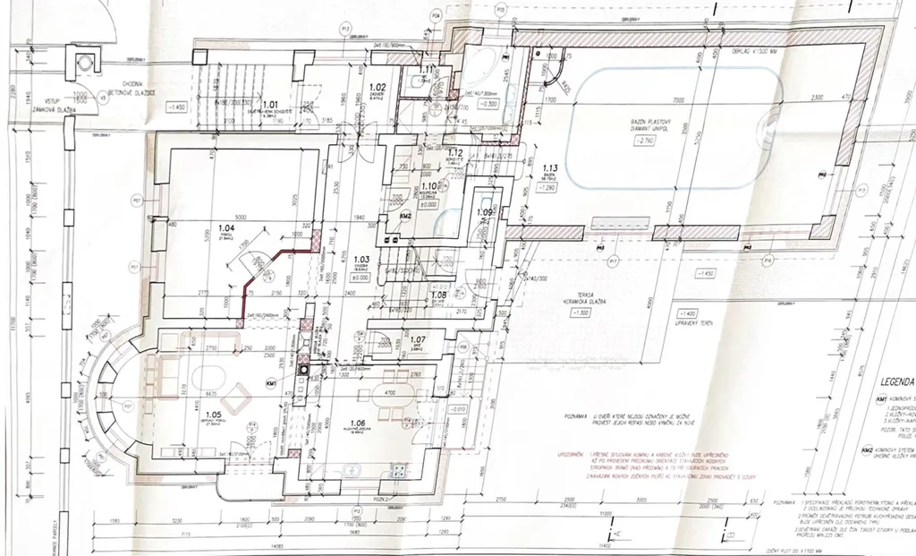 V 1.NP - zádveří s vestavěnými skříněmi, prostorná chodba, obývací pokoj s krbem, jídelna a navazující, moderní kuchyně s francouzským oknem a výhledem do zahrady. Z chodby je rovněž vstup do prostorů koupelny, sauny, vnitřního bazénu s protiproudem a sklepních prostorů. Z 1.NP se nádherným, původně zachovaným schodištěm dostanete do 2.NP. V obou patrech včetně mezipatří se nachází prostorné komory.