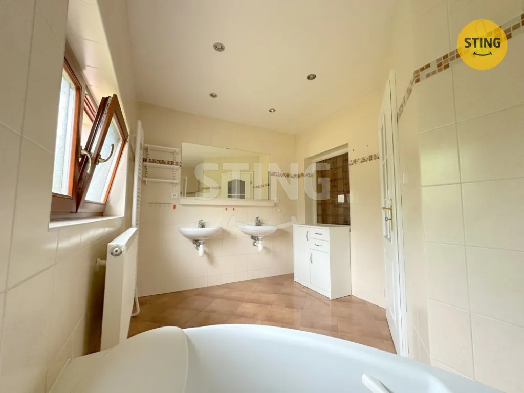 Obytné podkroví nabízí tři samostatné pokoje, z nichž jeden má kouzelnou atmosféru díky atypickým nízkým dveřím – ideální dětský pokoj nebo pokoj pro hosty. Dále zde najdete prostornou koupelnu s rohovou vanou, dvěma umyvadly a samostatným WC. Prostor je otevřený, světlý a díky orientaci obytných místností na jihovýchod a jihozápad krásně prosvětlený.