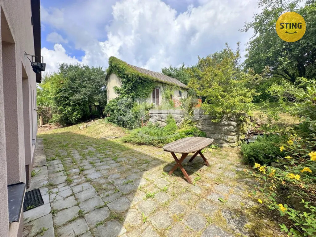 Pozemek je mírně svažitý, oplocený pletivem na ocelových sloupcích a osázený okrasnými i ovocnými dřevinami. Na zahradě stojí zděná kolna, která slouží jako dílna a sklad zahradního náčiní. Parkování je možné přímo na vlastním pozemku, příjezd je po zpevněné obecní komunikaci.
