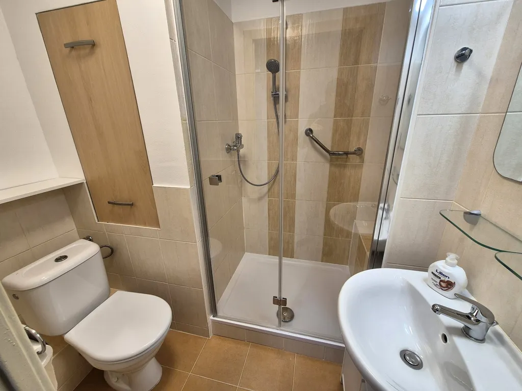Koupelna se sprchovým koutem a WC.