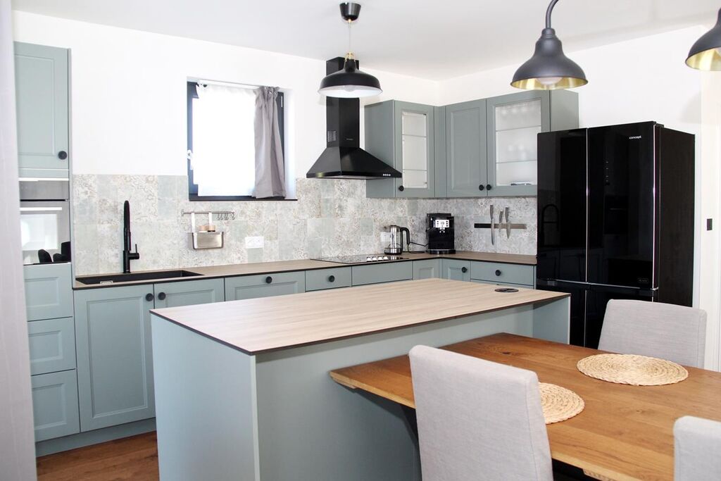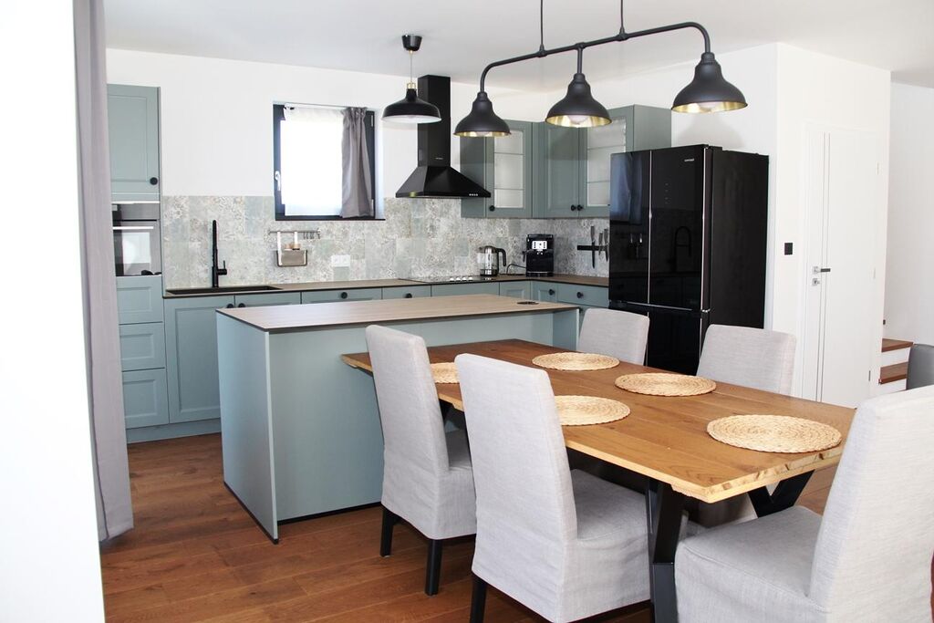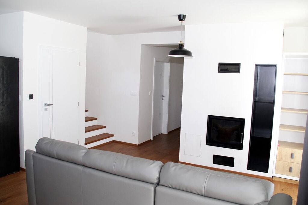 Interiér domu je dále vybaven kompletním zařízením koupelen, designovou kuchyňskou linkou na míru s moderními vestavěnými spotřebiči, krbovými kamny, vnějším i vnitřním osvětlením, nábytkem na míru apod. V případě rychlého jednání (při rezervaci nabídky do 30.9.2025) je možné zdarma ponechat dvoukřídlou americkou lednici, koženou sedací soupravu a postele s matracemi.