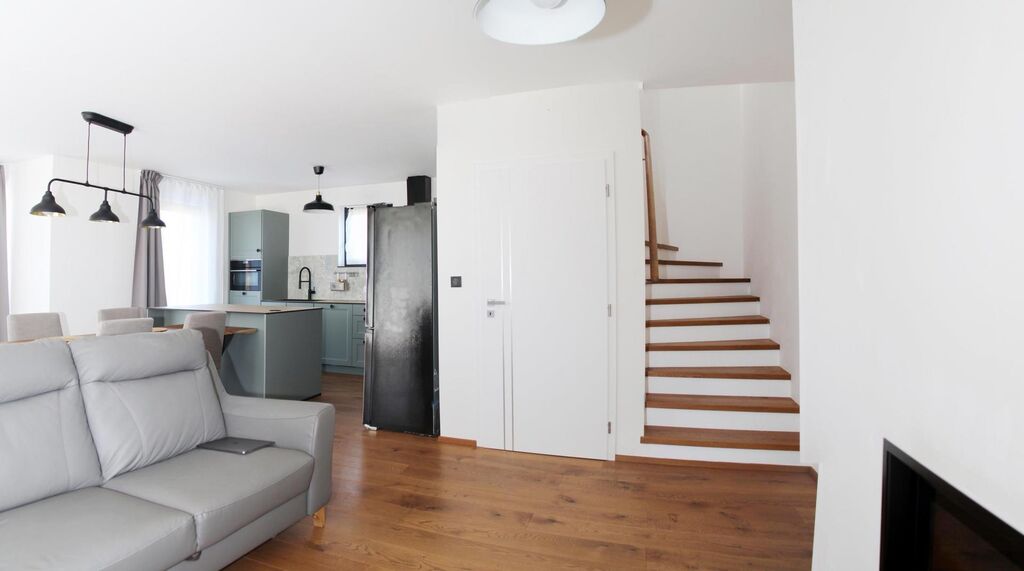 K prodeji nabízíme nadstandardní částečně vybavený patrový řadový dům (jednotku) o dispozici 5+kk se zahradou a vlastním parkováním pro dva vozy v nově vybudovaném dvojdomu v Kamenici - Těptíně, na rohu ulic Tavolníková a Tvrdá.