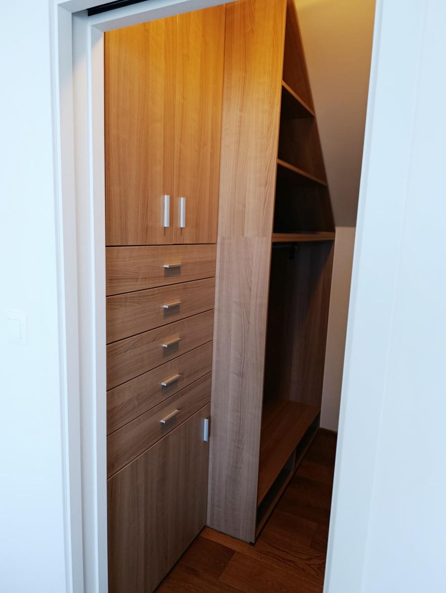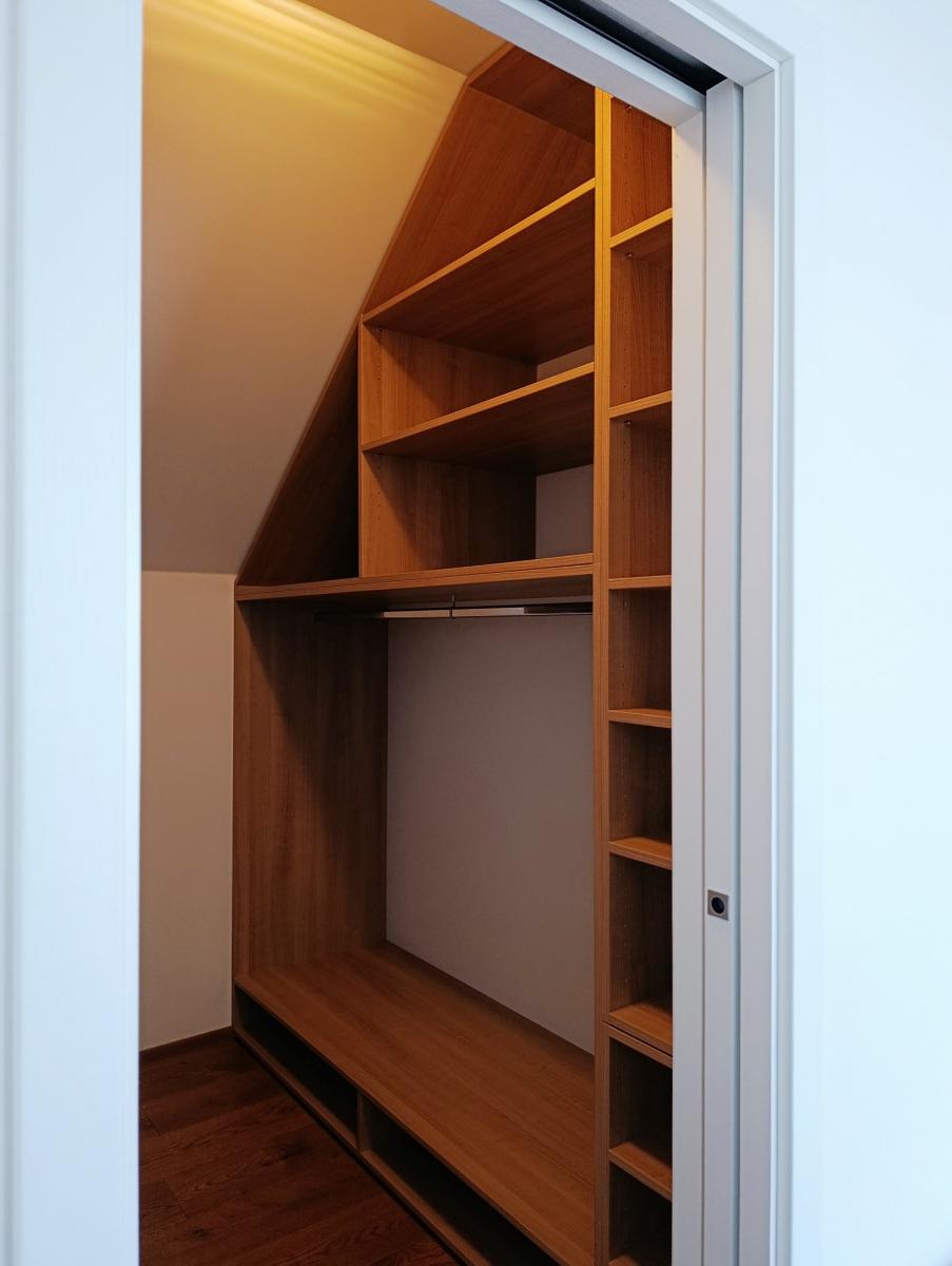 Dispozičně dům v přízemí sestává ze zádveří, předsíně, technické místnosti, pracovny (malého pokojíku), koupelny se sprchovým koutem a WC, prostorného obývacího pokoje s jídelním a kuchyňským koutem a spižírnou v prostoru pod schody a dále v patře ze dvou pokojů, ložnice s vlastní šatnou, samostatného WC a centrální koupelny s ocelovou vanou. V pobytových místnostech jsou položeny odhlučněné dřevěné podlahy a v zázemí domu podlahy z kvalitní keramické dlažby. V podstřeší se nachází velký půdní prostor s nízkou světlou výškou, který je však vhodný např. pro uskladnění sezónních či aktuálně nepotřebných věcí.