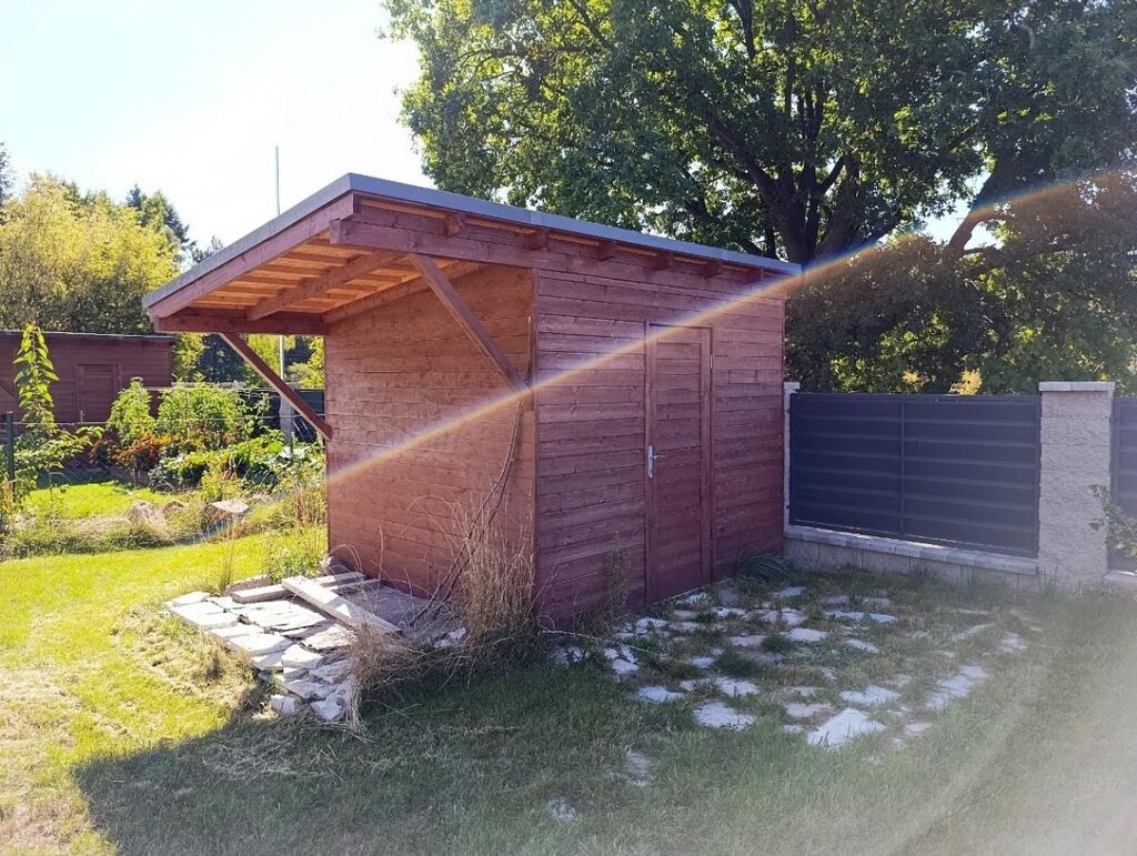 K jednotce dále náleží dvě parkovací stání a 30 m vrtaná studna sloužící pro obě jednotky jako zdroj vody na zalévání zahrad. Zahrada k předmětné jednotce je osazena ovocnými stromy a keři pro živý plot a nachází se zde prostorná kolna na zahradní techniku a nářadí a je zde též připravena elektroinstalace pro případný venkovní bazén.