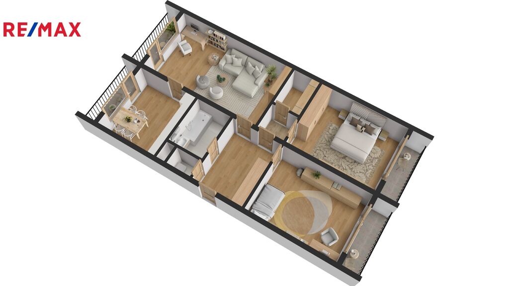 Dispozice bytu zahrnuje prostornou vstupní chodbu s místem pro velkou vestavěnou skříň, samostatnou toaletu, koupelnu s vanou a místem pro pračku, komoru, dvě ložnice a obývací pokoj propojený s kuchyní a jídelnou. V jedné z ložnic je velká vestavěná šatní skříň. Každý pokoj i kuchyň má přístup na vlastní lodžii. Bytové jádro je zděné, okna jsou plastová osazená žaluziemi. Dům prošel kompletní revitalizací včetně nové fasády, střechy a úprav společných prostor. V domě jsou dva výtahy a společná kolárna. K bytu náleží sklepní kóje umístěná v přízemí domu.