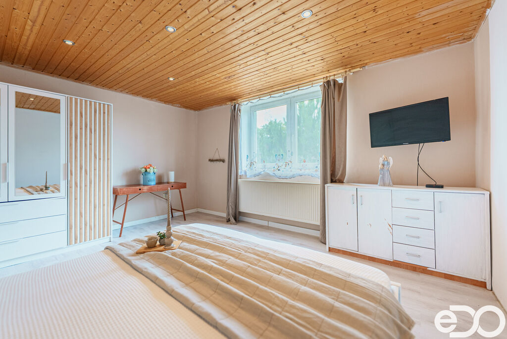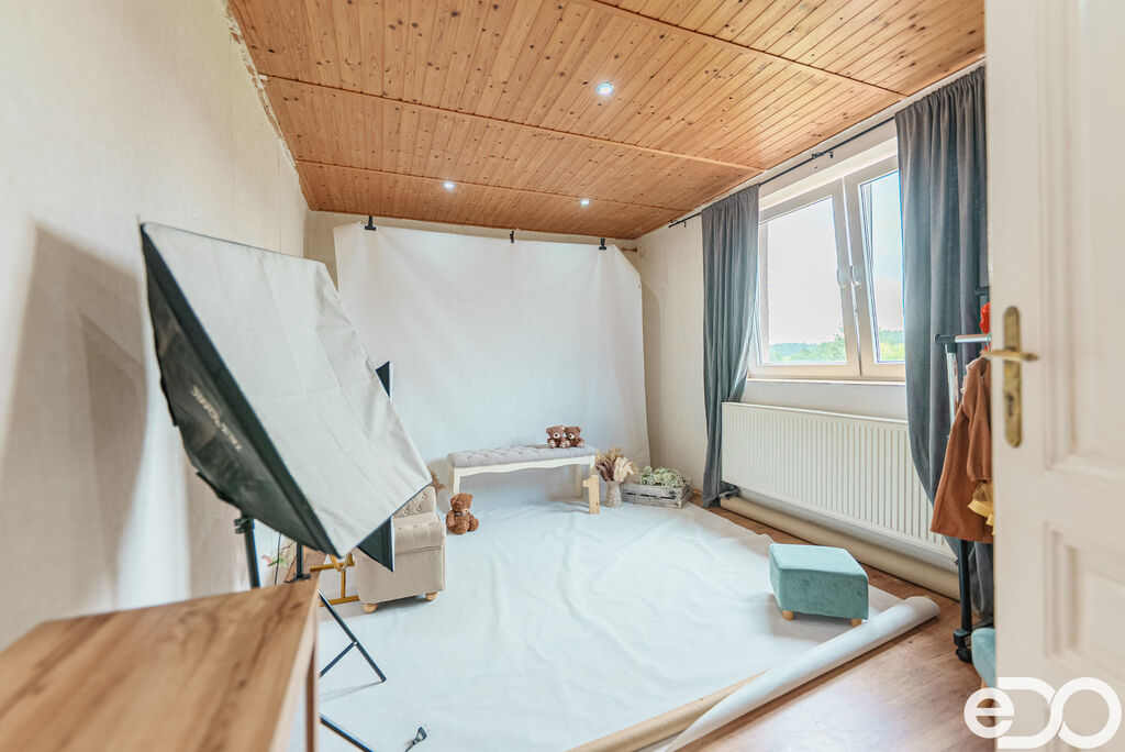 V patře se nachází ložnice, dětský pokoj, dvě komory a místnost zkolaudovaná jako fotoateliér. Tento prostor nabízí ideální podmínky pro domácí podnikání, kreativní činnost nebo tiché soukromí pro práci. Světlo, klid a dostatek místa dávají tomuto patru další dimenzi využití.