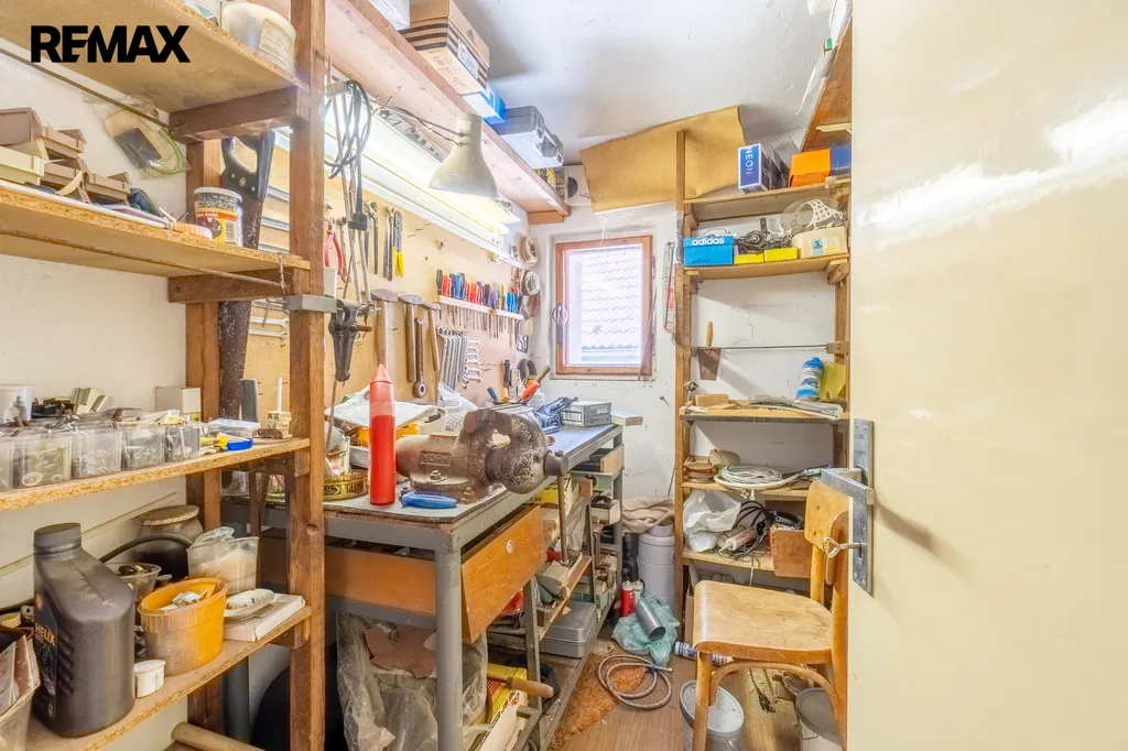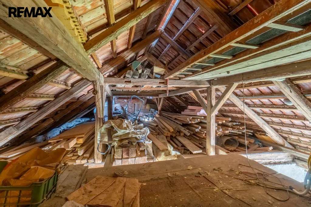V pravé části domu se nachází původní hospodářská část – kůlna a průjezd do zahrady. Tato část nabízí zajímavý potenciál pro přestavbu na další obytné místnosti, studio s výhledem do zahrady nebo pracovní dílnu.