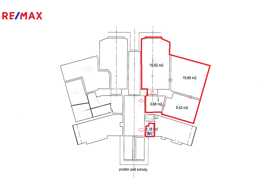 Prostor sestává ze tří samostatných místností o výměrách 19 m², 16 m² a 9 m², dále z kuchyňky o velikosti 4 m² a samostatné toalety.