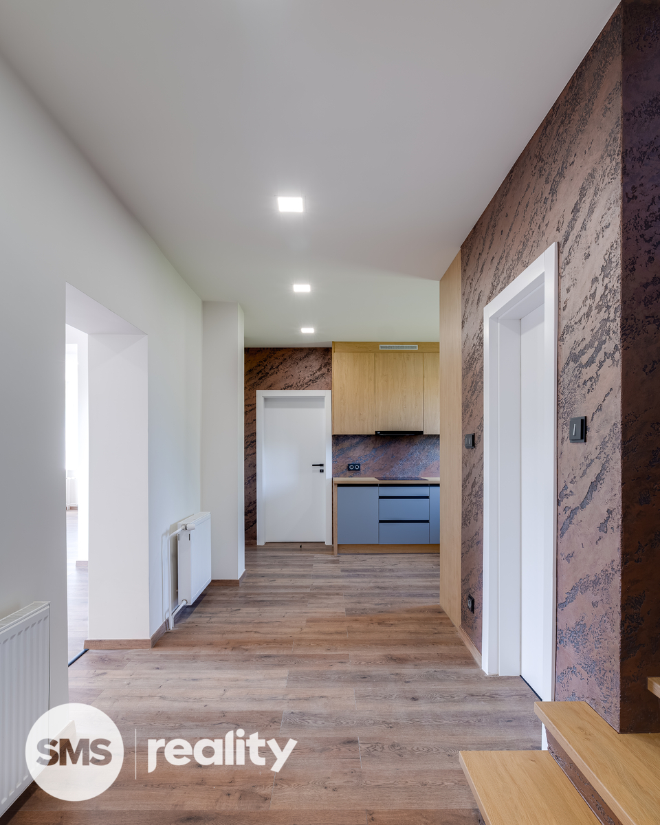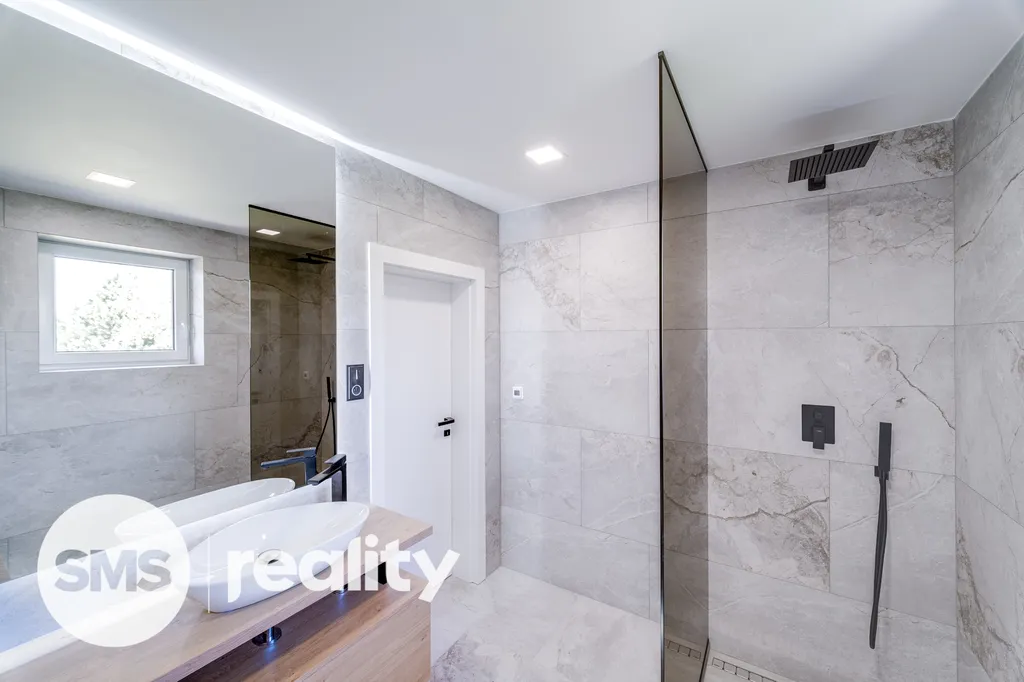 V přízemí vás přivítá reprezentativní vstupní hala, velkorysý obytný prostor s kuchyní, jídelnou a obývacím pokojem, doplněný pracovnou a koupelnou vybavenou vanou i sprchovým koutem. V patře se nacházejí tři samostatné ložnice a druhá koupelna se sprchou. Kuchyňská linka na míru je plně osazena špičkovými spotřebiči Bosch. Koupelny jsou vybaveny elektrickými topnými rohožemi pro maximální komfort.