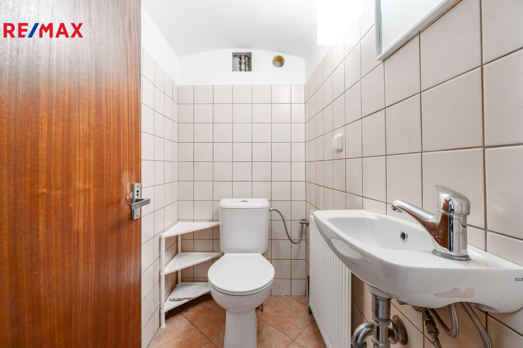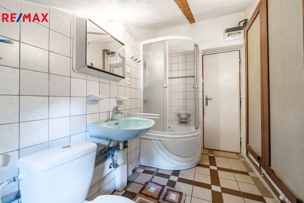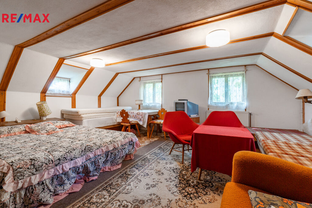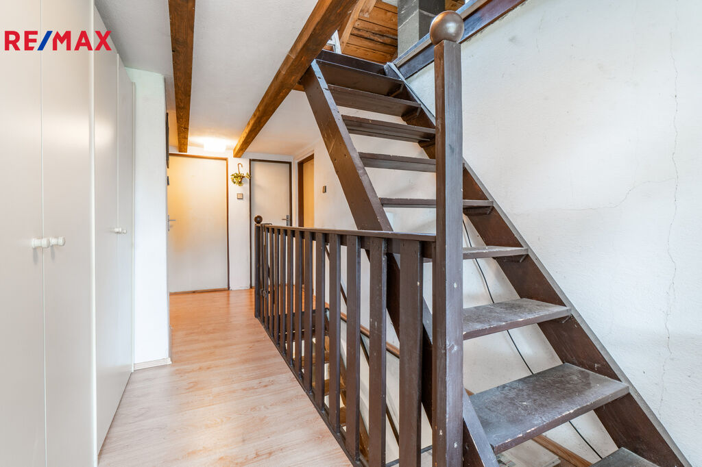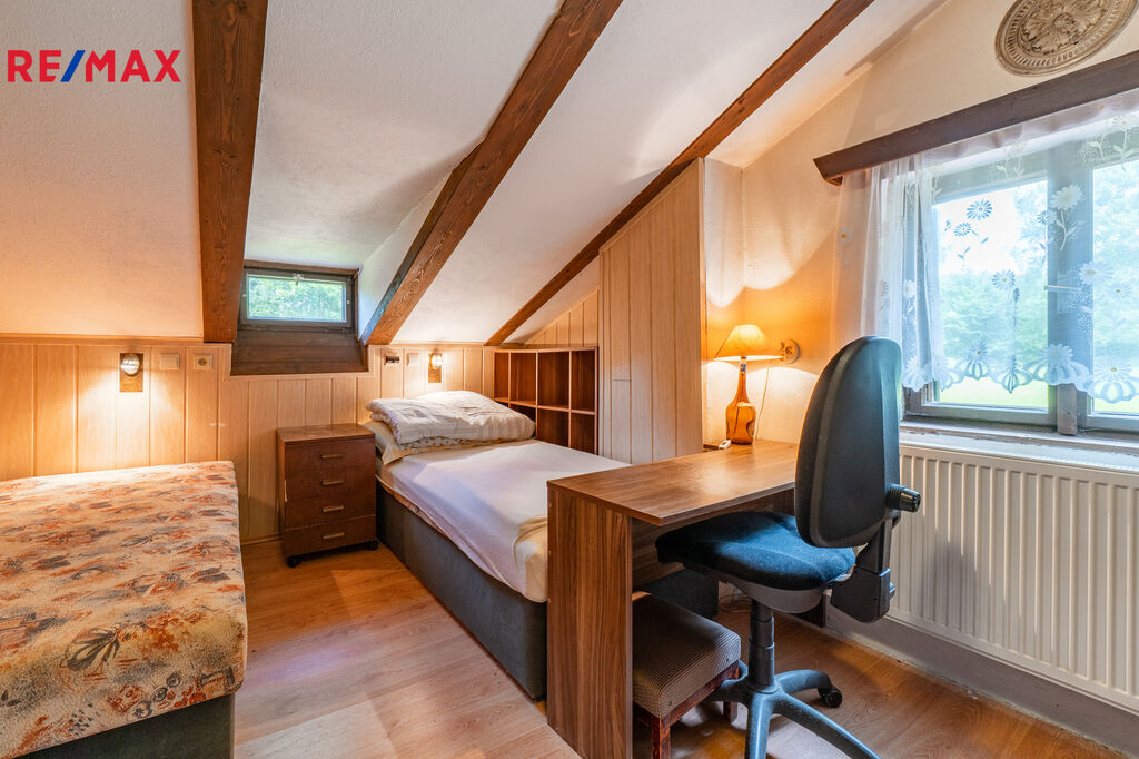 V patře je v podstatě samostatná bytová jednotka 2+kk, další dva pokoje, koupelna a WC.