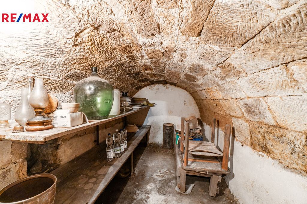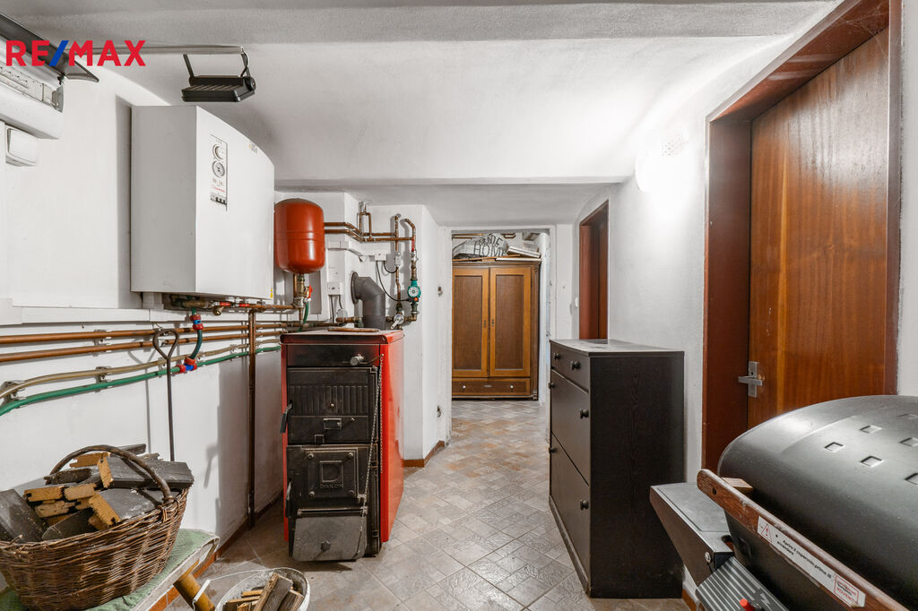 V přízemí se nachází hlavní místnost s kuchyňskou linkou a kachlovými kamny, dále další pokoj, chodba, koupelna, WC, sklep, kotelna a dílna.