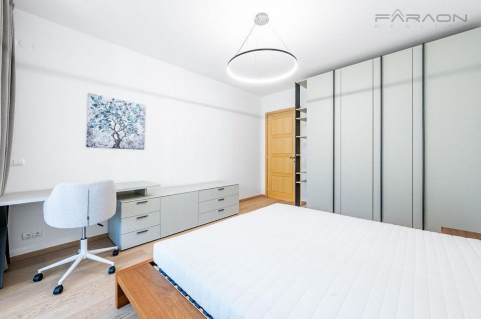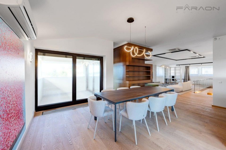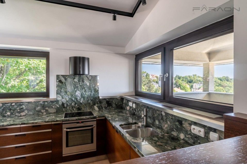 REZERVACE. Pronájem reprezentativního a mimořádně prostorného mezonetového bytu 4+kk (206 m2) se třemi terasami (22 m2), ze kterých je neopakovatelný výhled na Prahu, s garážovým stáním a sklepem v atraktivní a velmi klidné lokalitě na Královských Vinohradech. Celý byt se pronajímá kompletně zařízený a vybavený nábytkem na míru, viz. fotodokumentace. V rezidenčním domě je pouze 8 bytů, což zaručuje dostatek soukromí. V horním patře klimatizace, předokenní žaluzie.