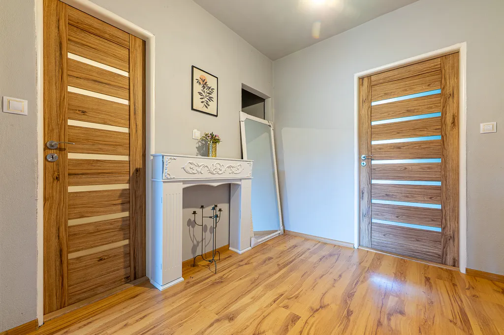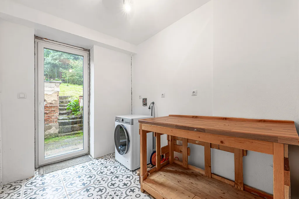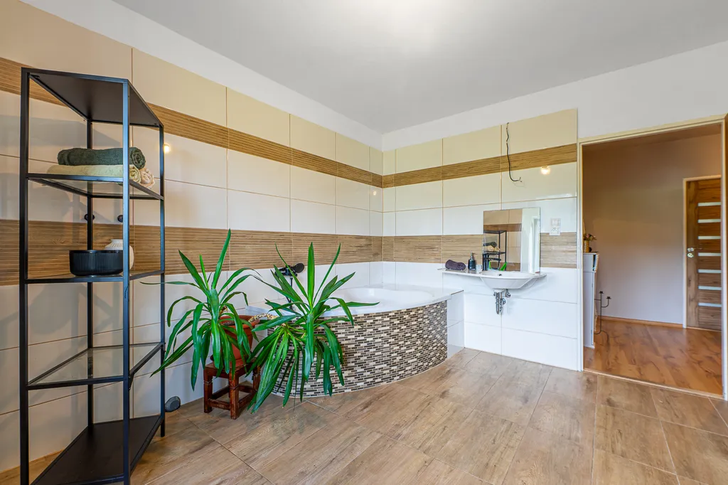 V přízemí domu se nachází prostorný obývací pokoj o ploše 36,6 m² s kuchyňským koutem. Obývací pokoj má okna orientovaná jak na sever, tak na jih, díky čemuž je místnost krásně prosvětlená. Dále je v přízemí WC, kotelna, zádveří a chodba. V patře jsou tři pokoje, koupelna, WC a sklad. Z ložnice je vstup na lodžii orientovanou na jih, která nabízí dechberoucí výhled do okolí. Prostorná koupelna je rovněž orientovaná na jižní stranu, vybavena rohovou vanou a připravena na instalaci sprchového koutu. V domě jsou nové rozvody elektřiny. Do domu je zaveden vodovod, kanalizace a elektřina. Vytápění a ohřev vody zajišťuje kotel na tuhá paliva – peletky. Dobré tepelně izolační vlastnosti domu zajišťují kvalitní plastová okna a zateplené podkroví.