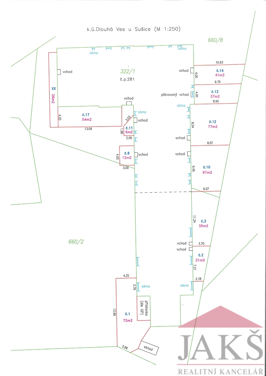 Celková plocha vč. vnitřních příček: 74,3 m2.