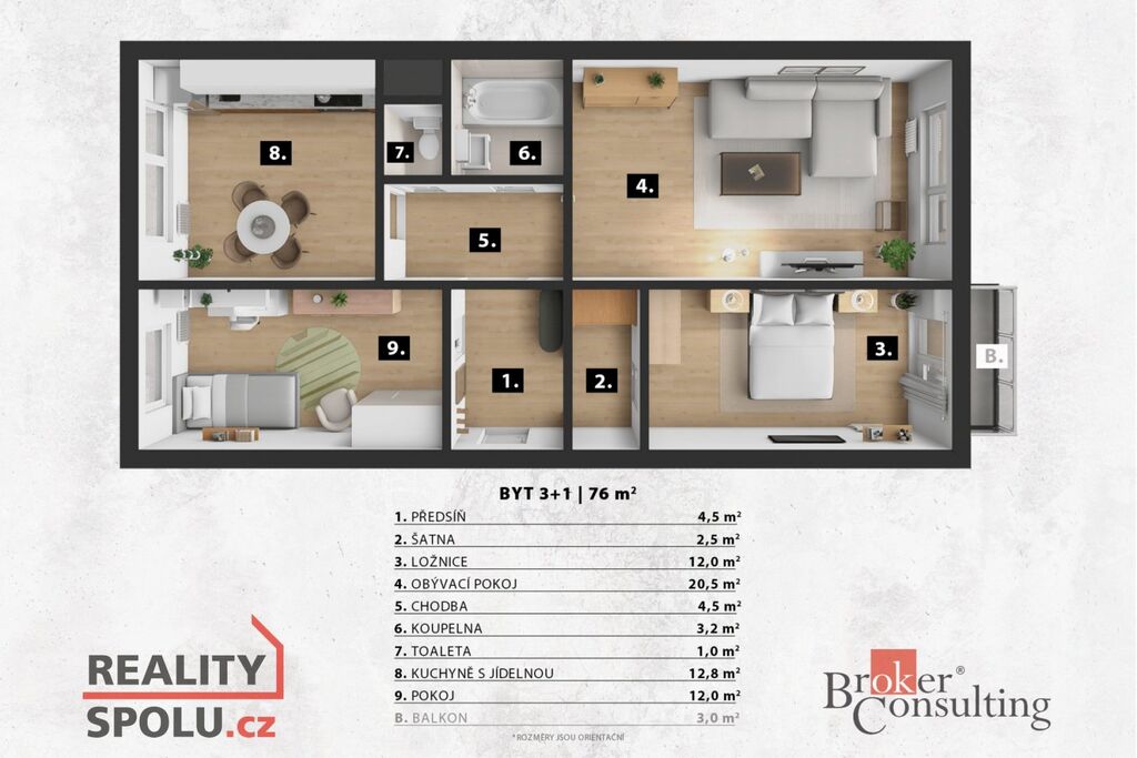Byt je světlý, funkčně řešený, s pěkným výhledem.