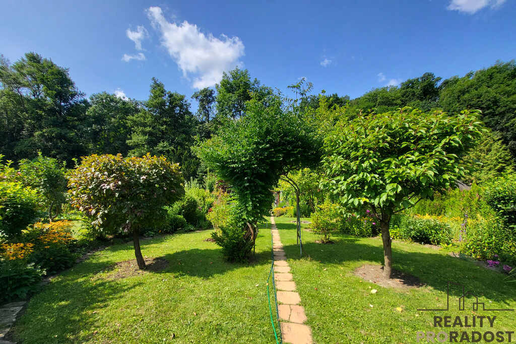 Pozemek je pečlivě udržovaný a pyšní se vzrostlými ovocnými stromy – jabloní, broskví, švestkou, kdouloňí či netradičním kiwi. Nechybí ani bobuloviny: maliny, ostružiny, borůvky, černý a červený rybíz, rakytník, černý jeřáb či dřín.