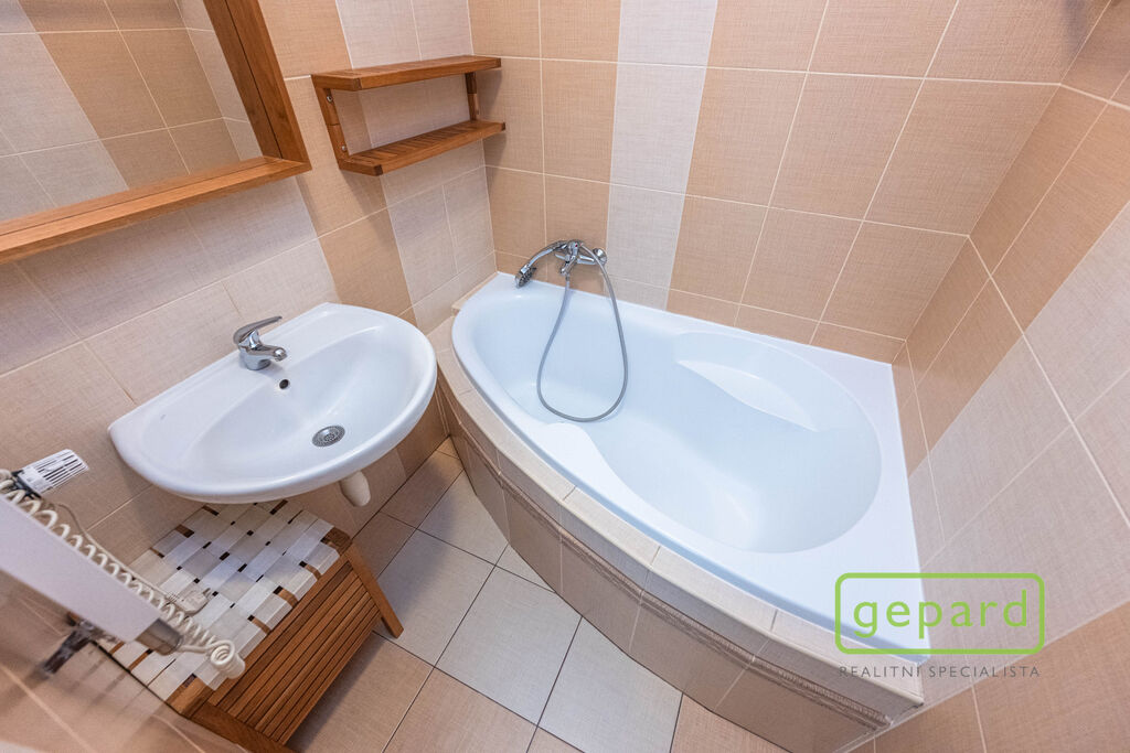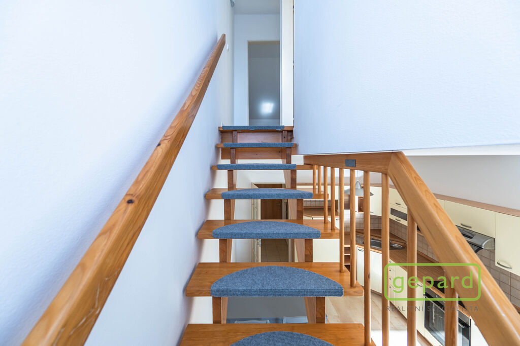 Celková plocha bytu činí 59 m2 včetně terasy (5,5 m2) a balkonu (2,5 m2). Byt je situován v 1. patře a v podkroví cihlového domu z roku 2006. Ve spodním patře bytu je obývací pokoj s kuchyňským koutem a vstupem na balkon (orientovaný na jihovýchod), předsíň a koupelna s toaletou. V horním patře je ložnice, pracovna kombinovaná se šatnou a koupelna s vanou. Z ložnice vede vstup na terasu, která je směrována na severozápad. V obytných místnostech je plovoucí podlaha, v předsíni a v koupelně je dlažba. Schody jsou dřevěné s protiskluzovými nášlapy. Na oknech jsou dvojité garnýže. Byt je z větší části vybaven nábytkem a spotřebiči, jak je znázorněno na fotografiích. Součástí pronájmu je vybavení uvedené zde v textu. Kuchyňská linka obsahuje vestavnou lednici, sklokeramickou varnou desku, elektrickou pečící troubu a digestoř a dále volně stojící mikrovlnnou troubu. V obývacím pokoji je k dispozici jídelní stůl se 4 židlemi a pohovka, v ložnici rám postele 200x180 cm včetně roštů a komoda a v pracovně trojdílná šatní skříň. V předsíni je botník se zrcadlem. V koupelnách je koupelnový nábytek a ve spodní koupelně je pračka. Nájemce může využívat společnou zahradu u domu. Parkovat lze volně na ulici.