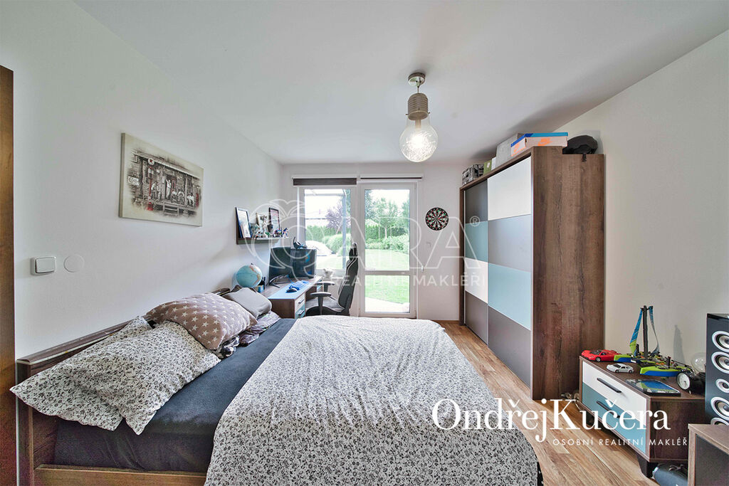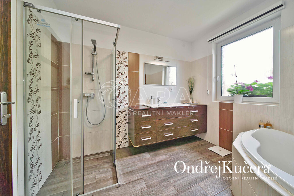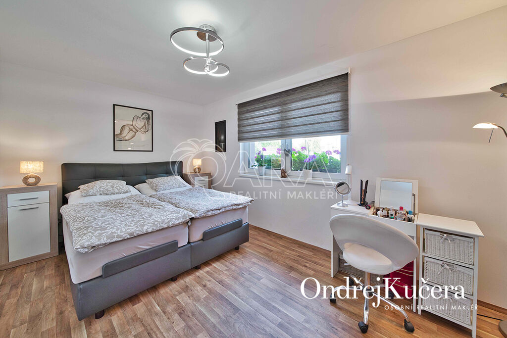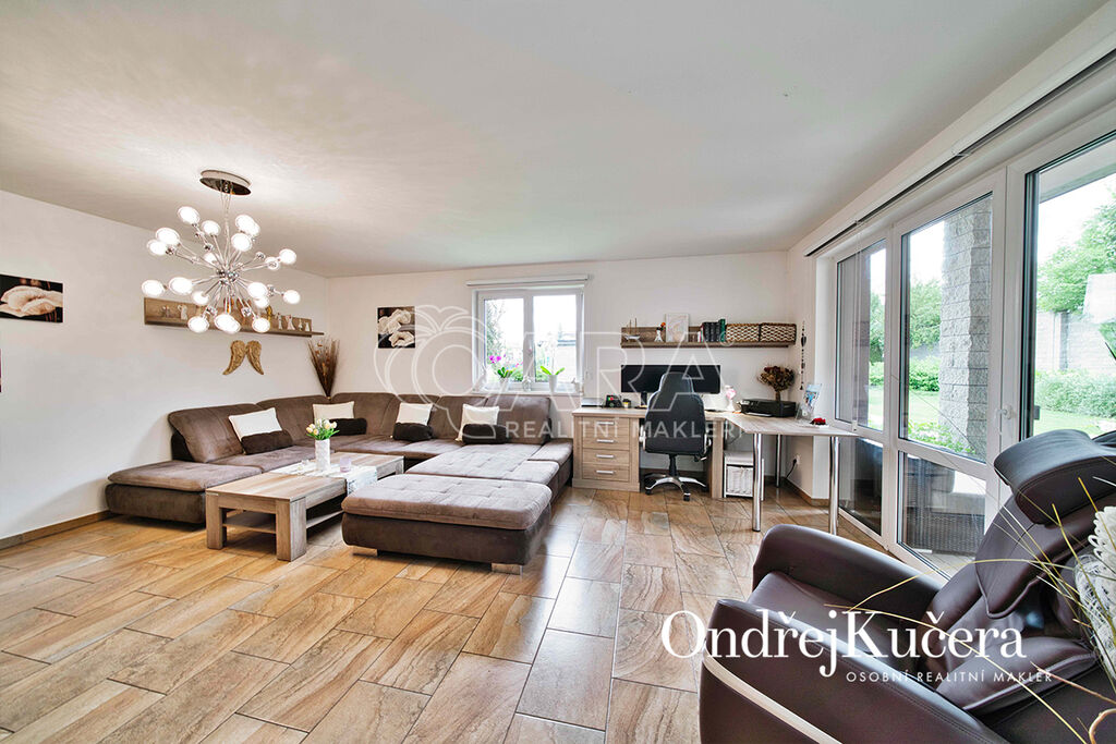 Interiér je navržen prakticky a moderně. Přes zádveří s vestavěnou skříní projdete do jídelny s kuchyní a dále do prostorného obývacího pokoje. Z centrální chodby máte přístup do dvou ložnic se vstupem na terasu. Dále do hlavní samostatné ložnice, prostorné šatny, technické místnosti, koupelny s rohovou vanou, sprchovým koutem a toaletou. Další toaleta je zvlášť. V obývacím pokoji o výměře přes 30 m2 je rodinný krb a vstup na krytou terasu. Kuchyň je od jídelní části oddělena decentním barovým pultem a je vybavena veškerými vestavěnými spotřebiči značek Bosch a Miele, včetně americké lednice. Vedle kuchyně je i samostatná spíž. Dveře a obložky jsou vyrobeny z masivu, okna mají moderní žaluzie typu den a noc, osvětlení je řešeno dekorativními LED prvky.