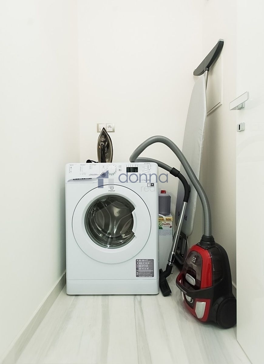 V ložnici manželská postel a šatní skříň. Koupelna s vanou a WC, komora s pračkou a vstupní hala s videotelefonem.
