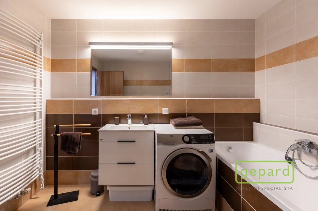 Koupelna je zařízena v moderním stylu, s vanou, WC a prostorem pro pračku. Druhé WC je umístěno samostatně a má vlastní umyvadlo, což přidává na každodenním komfortu.