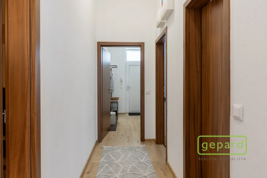 Do bytu vstupujete přes příjemnou předzahrádku, osázenou okrasnými rostlinami, která zároveň nabízí praktické místo pro parkování kol. Prostorná předsíň pak poskytuje ideální prostor pro šatní skříně i další úložné prvky.