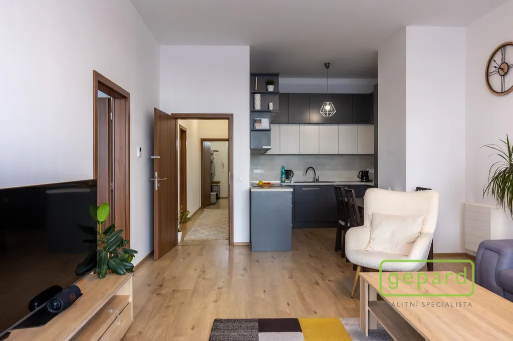 Hlavní obytnou část tvoří velký a otevřený obývací pokoj s kuchyní o rozloze 32,3 m². Kuchyň je vyrobena na míru truhlářem z kvalitních materiálů, vybavena vestavnými spotřebiči (lednice, myčka, trouba, varná deska, digestoř) a navržena s důrazem na maximální praktičnost. Vysoké stropy v celém bytu dodávají interiéru pocit vzdušnosti. Sjednocená plovoucí podlaha v dekoru dřeva bez prahů a čisté linie s podhledy podtrhují moderní a elegantní atmosféru bytu.