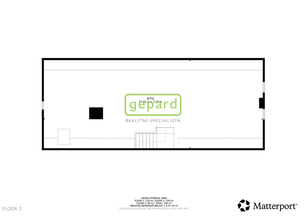 Dům s využitelnou plochou cca 335 m² a pozemkem 333 m² je v současné době dispozičně řešený jako tři jednotky (4+1,G, 2+1). Nemovitost je určena k celkové rekonstrukci (topení, elektroinstalace, podlahy, stropy, koupelny), nicméně v roce 2005 proběhla kompletní výměna střechy.