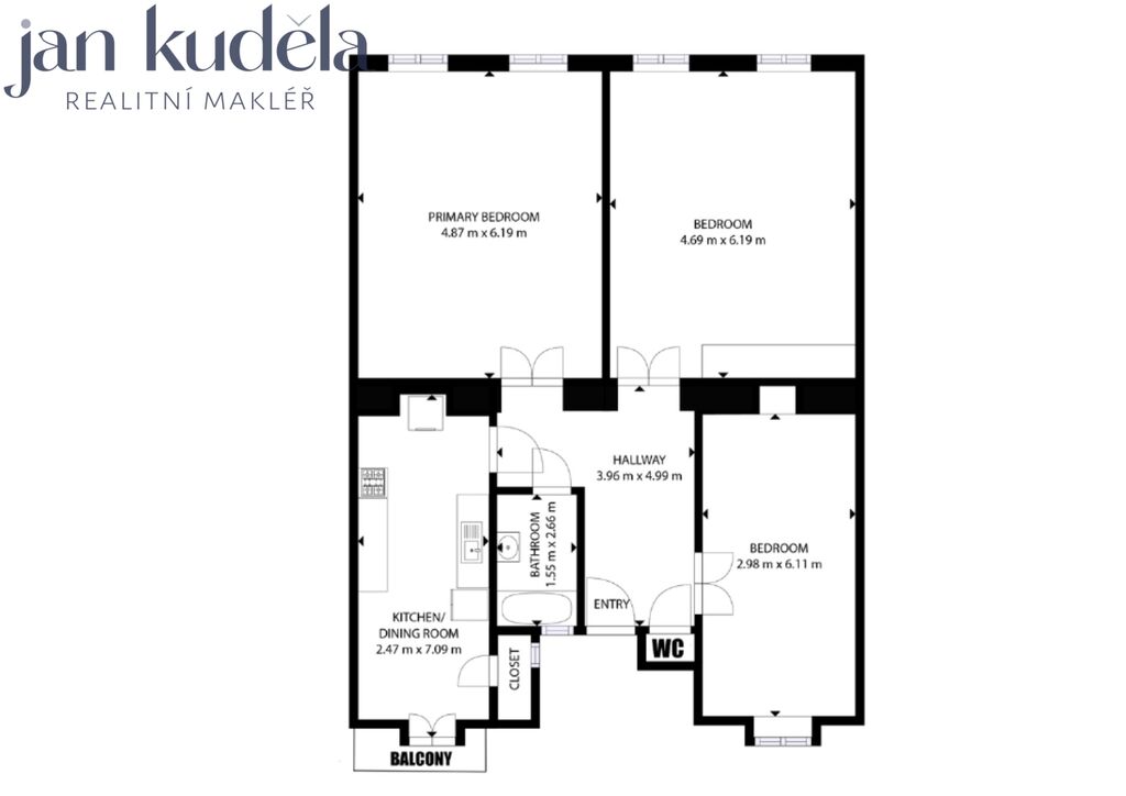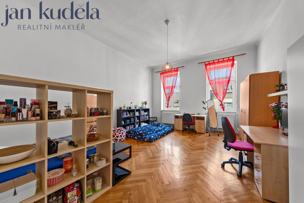 Dispozičně byt nabízí tři samostatné pokoje – dva jsou orientovány do ulice a jeden do klidného vnitrobloku. Kuchyně je rovněž situována do vnitrobloku s balkonem o velikosti 3,45 m2. V současné chvíli jsou všechny pokoje neprůchozí, nicméně dispozici je možné upravit tak, aby pokoje na sebe navazovaly a byly průchozí.
