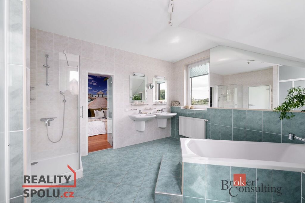 - Koupelna se sprchovým koutem, vanou a dvěma umyvadly