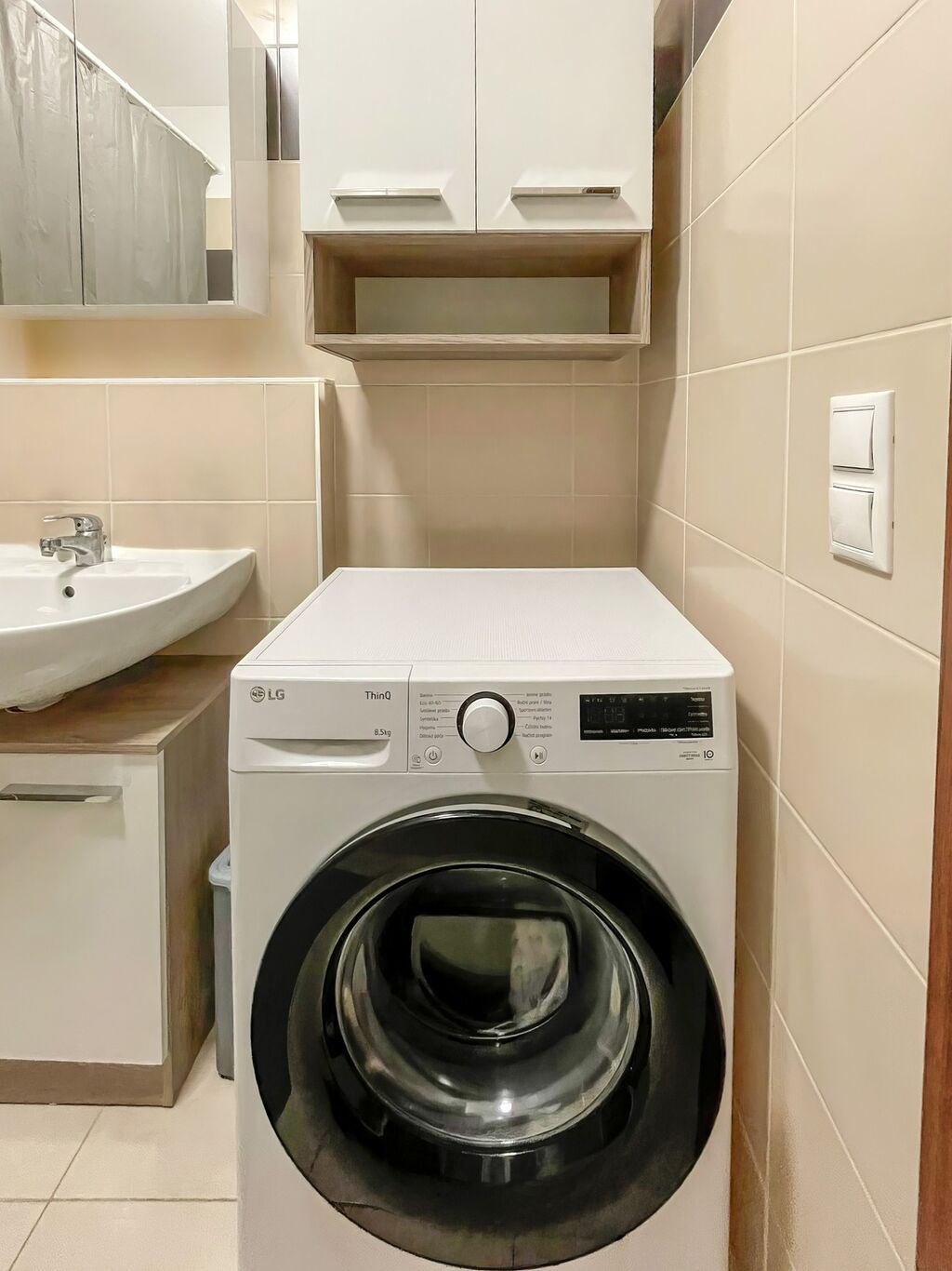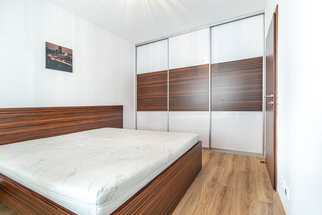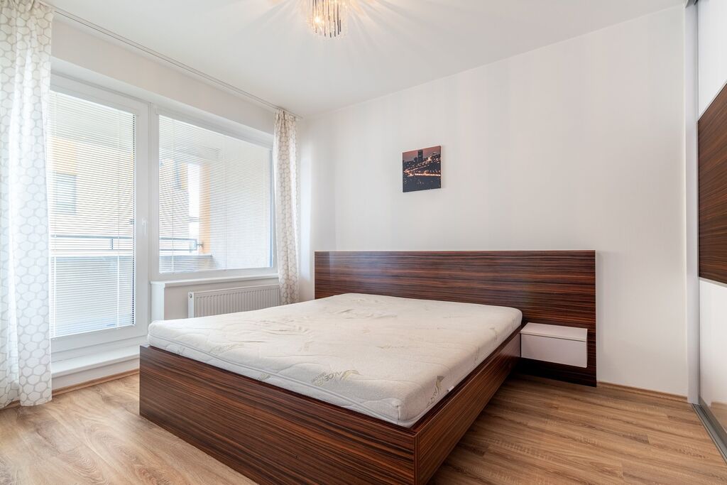 Moderní byt o celkové podlahové ploše 54m2 (+balkon 5m2) se nachází ve druhém nadzemním podlaží novostavby z roku 2013. Interiér bytu tvoří obývací pokoj se stylovou plně vybavenou kuchyní včetně sklokeramické varné desky s horkovzdušnou troubou a digestoří, mikrovlnné trouby, vestavné lednice a myčky nádobí. Zde se také nachází kuchyňský stůl se židlemi a velkou pohovkou se skříňkou pod televizí. Z obývacího pokoje je přístup na balkon plochou 5m2. Dále je ložnice, kde se nachází manželská postel s nočními stolky. Kromě toho je zde i další vstup na balkon. Krásná koupelna s vanou a pračkou. Toaleta s WC a umyvadlem je oddělená. Na chodbě je velká vestavěná šatní skříň s posuvnými zrcadlovými dveřmi. Komfortní ubytování doplňuje plovoucí podlaha a dlažba.