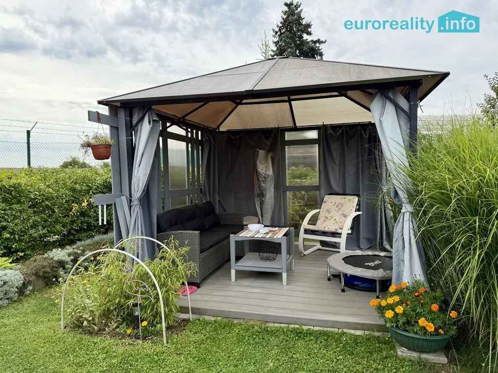 Součástí prodeje je i pergola. Výhodou je vlastní parkovací místo přímo u zahrady.