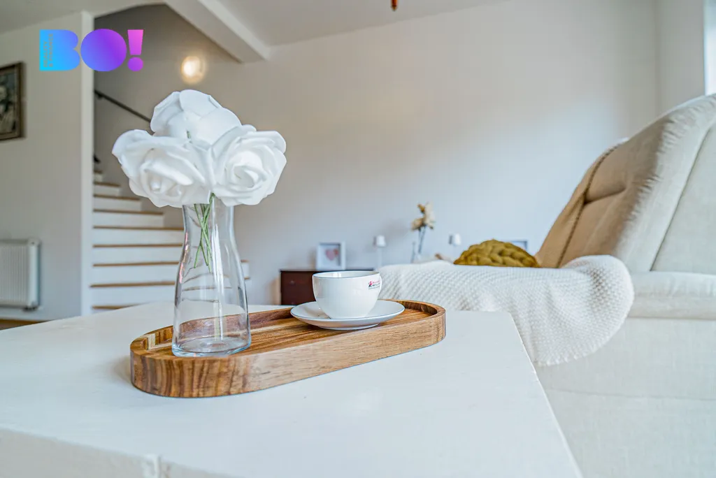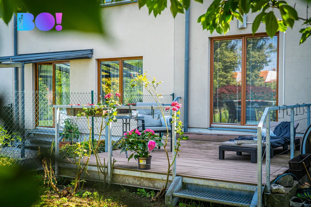 Kuchyň propojená s obývacím pokojem nabízí 55 m² nadčasového prostoru s velkým množstvím denního světla – vysoké stropy a velká okna vytváří vzdušný dojem, který nebývá v řadových domech obvyklý. V celém domě naleznete kvalitní dřevěné masivní podlahy, dveře a zárubně i dřevěná střešní okna Velux a nadčasový design. V domě jsou dvě koupelny a každé patro má min. 1 WC, což je komfortní i pro větší rodinu nebo zástupce více generací. Všechna okna jsou opatřena žaluziemi.