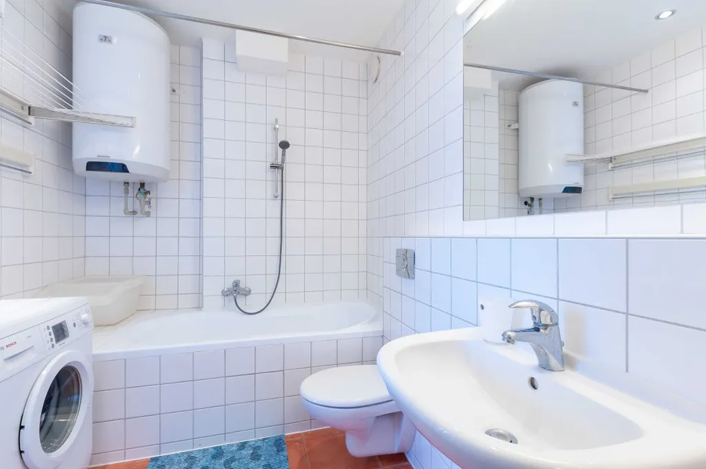 V bytě se nachází moderní kuchyňská linka s troubou, sklo keramickou deskou, mikrovlnou troubou, digestoří, lednicí a myčkou. V koupelně je k vana, pračka, umyvadlo se zrcadlem a WC.