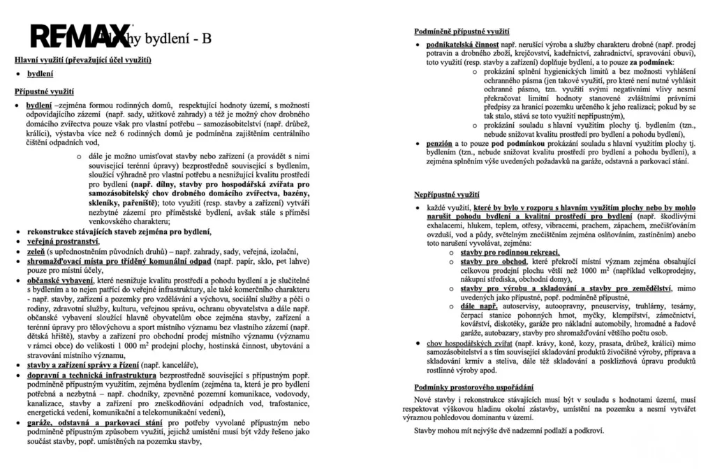 • Územní plán: plocha B – plochy bydlení (možnost výstavby řady rodinných domů, venkovský charakter, nebo bytových domů zapadajících do reliéfu obce)