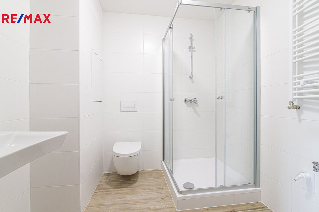 Byt disponuje moderní koupelnou se sprchovým koutem a toaletou, která je součástí jednoho celku – praktické a elegantní řešení v moderním stylu.