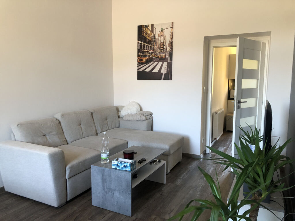 Byt má praktické uspořádání – prostorný pokoj, který lze využít jako ložnici s obývacím koutem, a samostatnou kuchyň s kompletně vybavenou linkou (varná deska, trouba, myčka, lednice). Koupelna je vybavena sprchovým koutem, umyvadlem a toaletou.