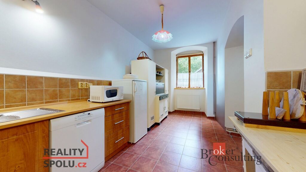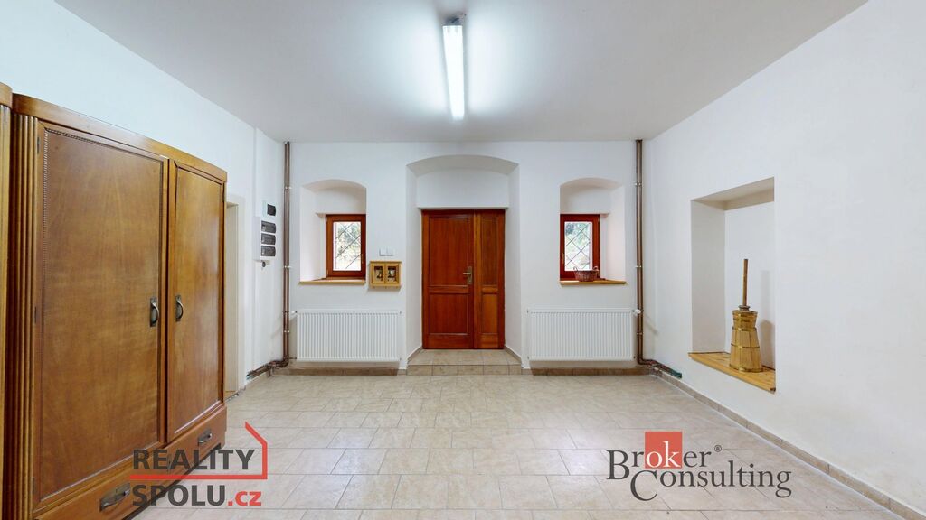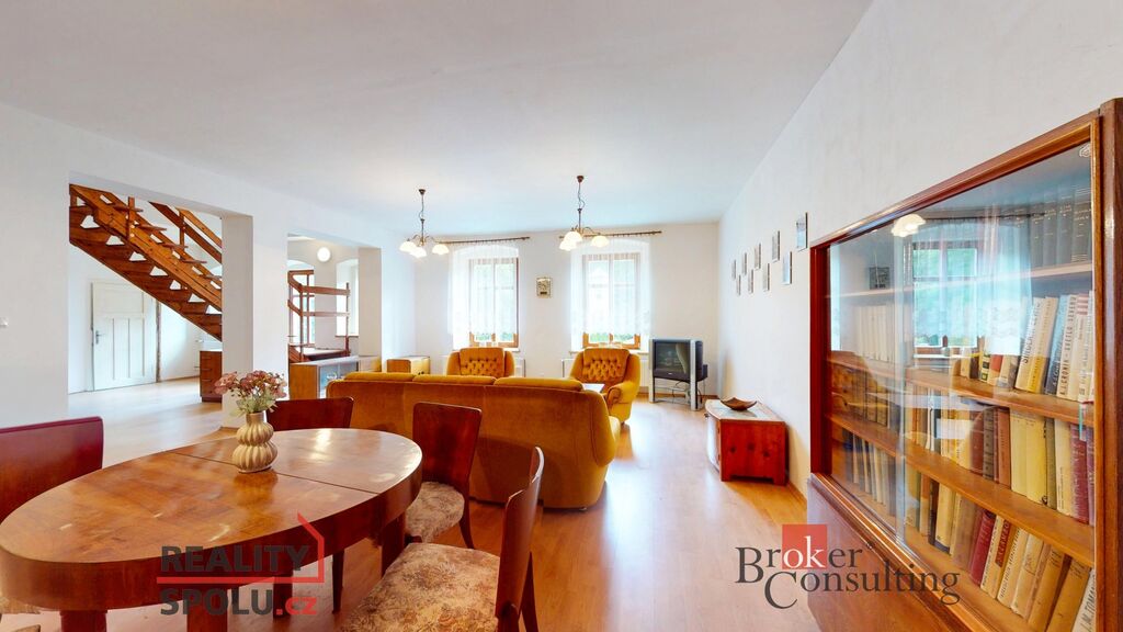 Dispozičně dům nabízí přízemní prostornou halu s kuchyní, koupelnou a obytnou místností, v prvním patře domu je velmi prostorná hala s obývací částí a dvě samostatné ložnice a v podkroví jsou další dvě velké ložnice, samostatná toaleta a místnost pro kuchyňku či jiné využití. Dům je částečně podsklepen, ve sklepě se nachází studna, která je zdrojem vody. Ohřev teplé vody je zajištěn bojlerem, vytápění elektrickým kotlem či kamny na dřevo v přízemí a dům má i vlastní čističku odpadních vod. Ta je umístěna na pozemku přes silnici, který je také součástí prodeje i se starou zděnou budovou sloužící původně jako hasičárna.