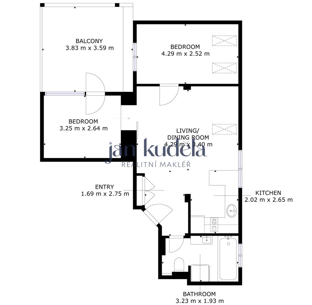 Dispozice bytu je promyšlená: vstupní část vás přivede přímo do světlého obývacího pokoje s kuchyní, odkud je vstup do dvou samostatných ložnic a koupelny s toaletou. Koupelna je vybavena vanou a plynovým kotlem, který zajišťuje vytápění i ohřev vody. O pohodlí v letních měsících se postará klimatizace.