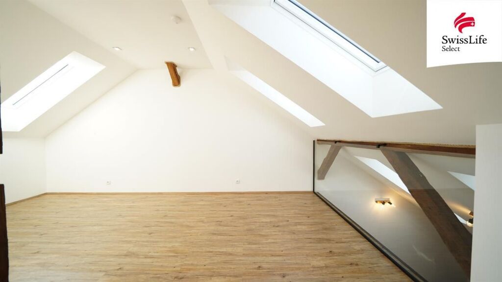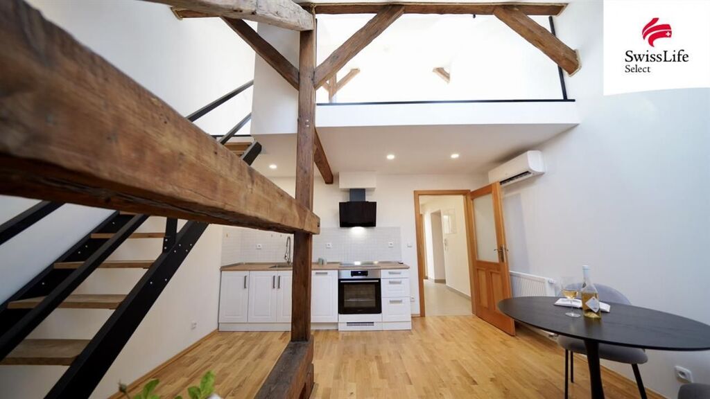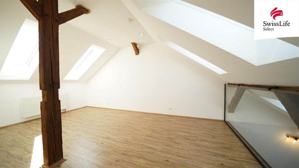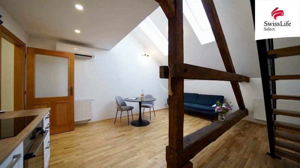 Stylové dřevěné trámy dodávající bytu jedinečný charakter.