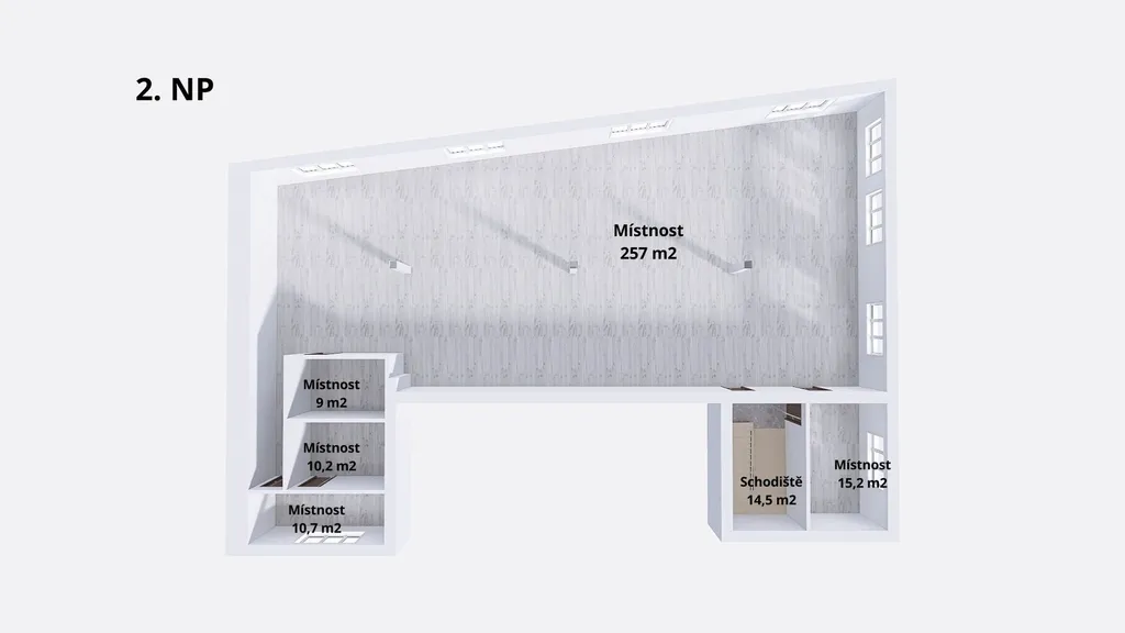 1. patro cca 317 m² – velký otevřený prostor, ideální pro fitness, call centrum, showroom, ordinace či školící prostory, možnost vybudování sociálního zázemí