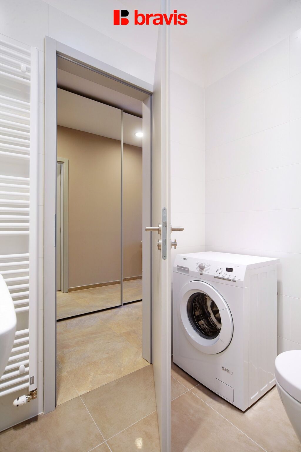 Byt je částečně zařízený a vybavený moderní kuchyňskou linkou se všemi potřebnými spotřebiči (varná deska, trouba, digestoř, mikrovlnná trouba, lednice, myčka, pračka). K dispozici jsou vestavěné skříně, pohodlné postele, obývací stěna, moderní osvětlení, sedačka, jídelní stůl se čtyřmi židlemi a TV stolek. Interiér bytu je vkusně sladěný do moderních tónů, což podtrhuje luxusní charakter nemovitosti.