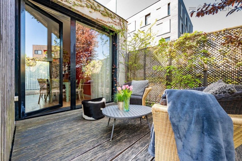 První (horní) podlaží představuje privátní obytnou část domu dvě komfortní ložnice, dvě koupelny (jedna s vanou) a prostorná terasa, která nabízí klidné zázemí s výhledem do zeleně.