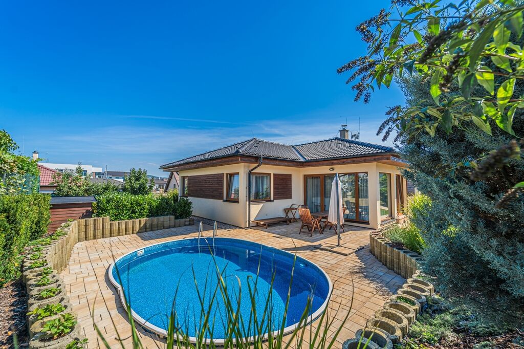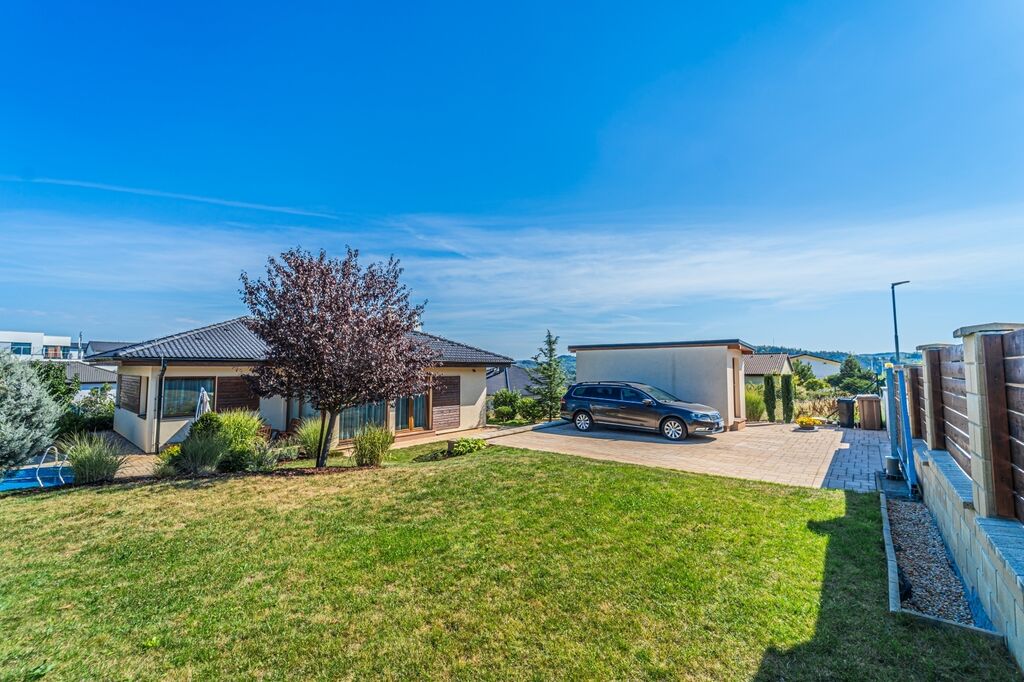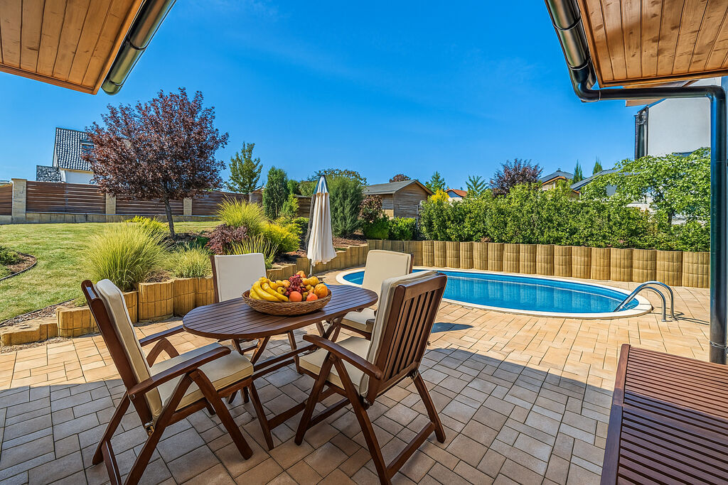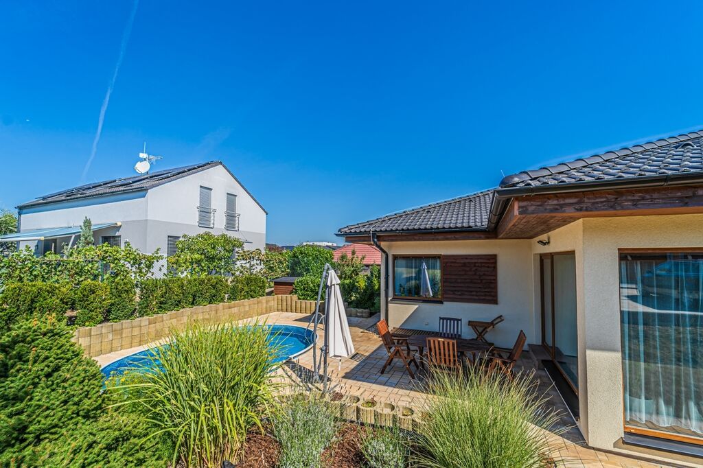 Součástí zahrady je zapuštěný bazén o objemu 18 m³ s rozměry 5,5 × 3,7 metru, pískovou filtrací a solární plachtou. U bazénu se nachází terasa s příjemným posezením, ideální pro letní odpočinek nebo rodinné grilování. Dále je na pozemku akumulační nádrž na dešťovou vodu o objemu 5 m³, podružný vodoměr pro zalévání, venkovní osvětlení a samostatný sklad o ploše 7,5 m². Vjezdová brána je vybavena elektrickým pohonem s dálkovým ovládáním a umožňuje komfortní parkování dvou vozidel na vlastním pozemku. Celý pozemek je oplocen a zahrada je osázena okrasnou zelení, která dotváří příjemnou atmosféru.